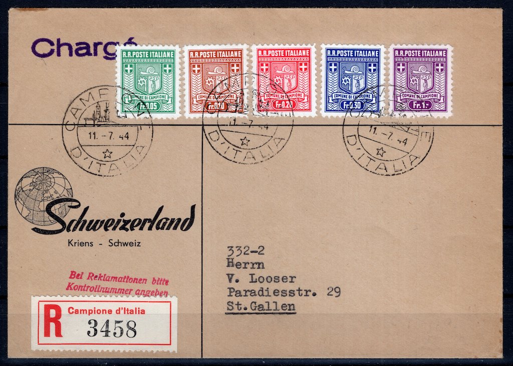 | Campione: 1944 First Issue Set Cover Sent to St. Gallen |